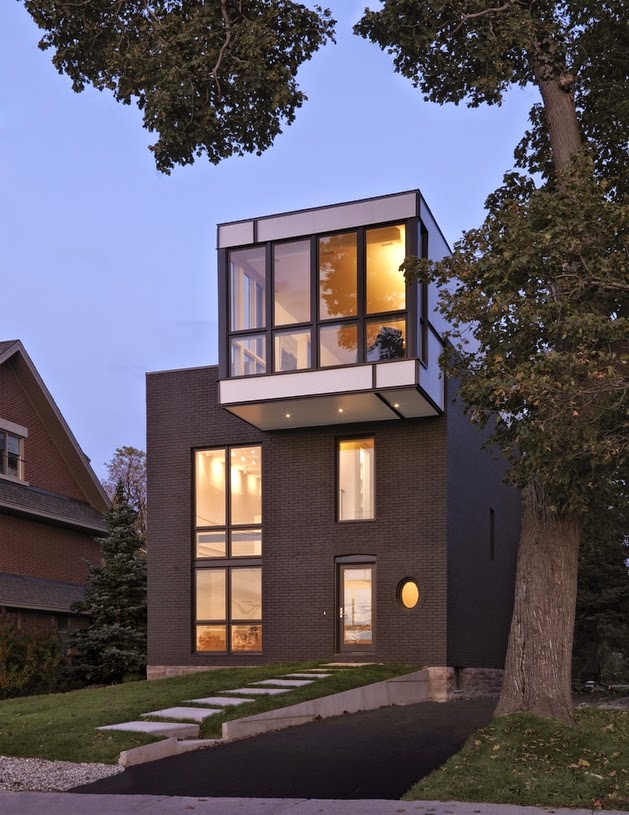 Pintu masuk utama berada sempurna di bawah salah satu kantilever. Kantilever ini tampak terpisah dari bangunan dasar menawarkan kesan yang sangat unik untuk penampilan rumah ini. Penurunan ketinggian plafon menawarkan suasana yang lebih intim saat memasuki pintu. Renovasi rumah ini mempertimbangkan setiap anggota keluarga saat mendesain ulang semua bagian.